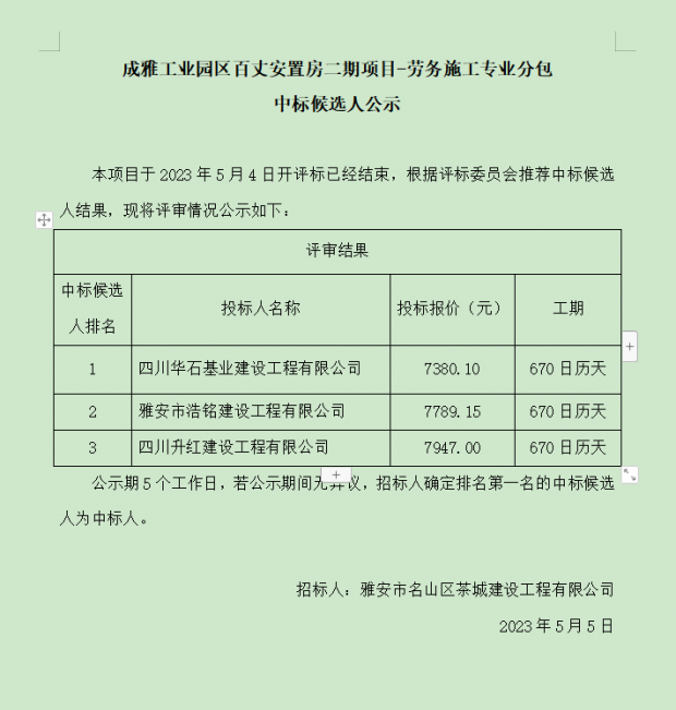成雅工業(yè)園區(qū)百丈安置房二期項目-勞務(wù)施工專業(yè)分包中標(biāo)候選人公示